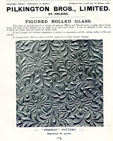 The Tinted Figured Rolled Glass range had 14 patterns, some of which came in multiple sizes and about 100 different shades. Pilkington recommended the product for public buildings, or for any situation where maximum light was required with some privacy.