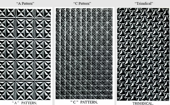 The patterns listed include Arctic large and small, three sizes of Muranese, three sizes of Morocco (including “pinhead” size), Cretan, Oceanic, Rose, Maltese, Japanese, Kaleidoscope, Rippled, Quilted, Persian, Shell and Arabesque. Only four of the patterns are illustrated in the catalogue, as per below.